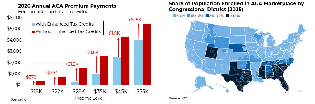 As a reminder, the expiration of the enhanced premium tax credits is only one of the ways in which Congress has unwound key elements of Obamacare. The One Big Beautiful Bill Act enacted a number of changes to Medicaid – particularly the imposition of a work requirement – that are estimated to result in 10 million fewer Americans with health care in 2035 than would have otherwise been the case. Coupled with an estimated 4.2 million fewer because of the loss of the tax credits, it amounts to a roughly 70% reversal of the progress in coverage achieved since the passage of the A.C.A.