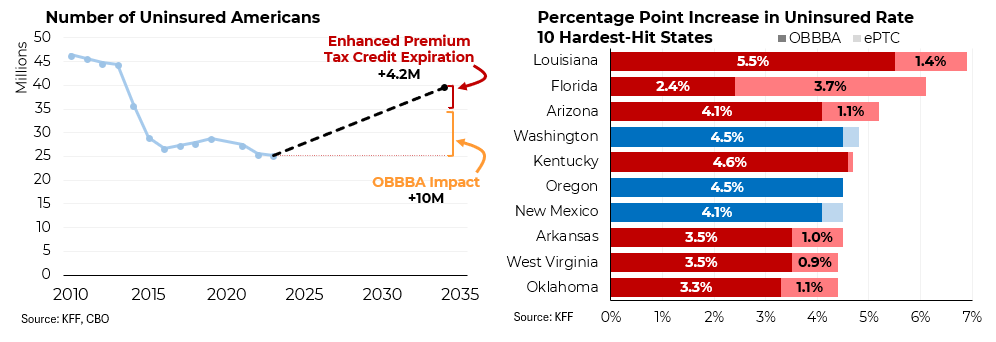 With those two sets of changes combined, the biggest impact is likely to be disproportionately felt in the red states (7 of the top 10). Particularly in Florida, the loss of the premium tax credits will play a significant role in this increase in the number of uninsured. In contrast, the three most affected “blue states” will be most impacted by the OBBBA.