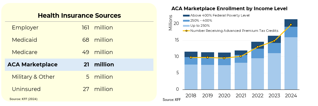In 2020, under the leadership of President Joe Biden, Congress passed an expansion of the tax credits that were originally part of Obamacare for individuals who purchase their insurance on the marketplaces. That caused the number of people who took advantage of this path to coverage to soar, to 24.3 million in 2025 from 11.4 million in 2020. Nearly all of those participants are at the lower end of the income scale and so they avail themselves of the tax credits.